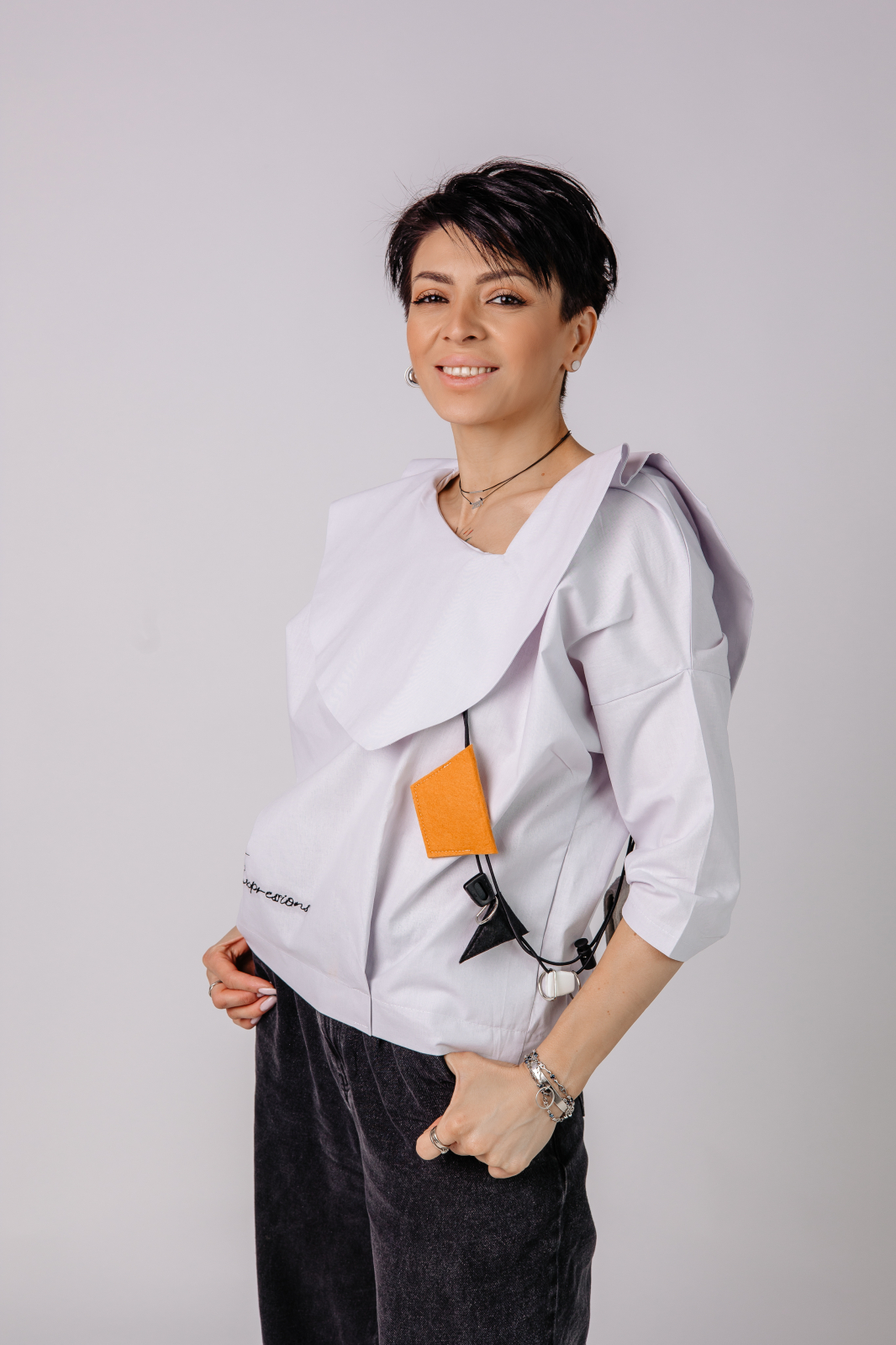 Bluza din bumbac 100%, cu guler supradimensionat, maneci 3/4, pliuri la baza si accesorii confectionate manual.