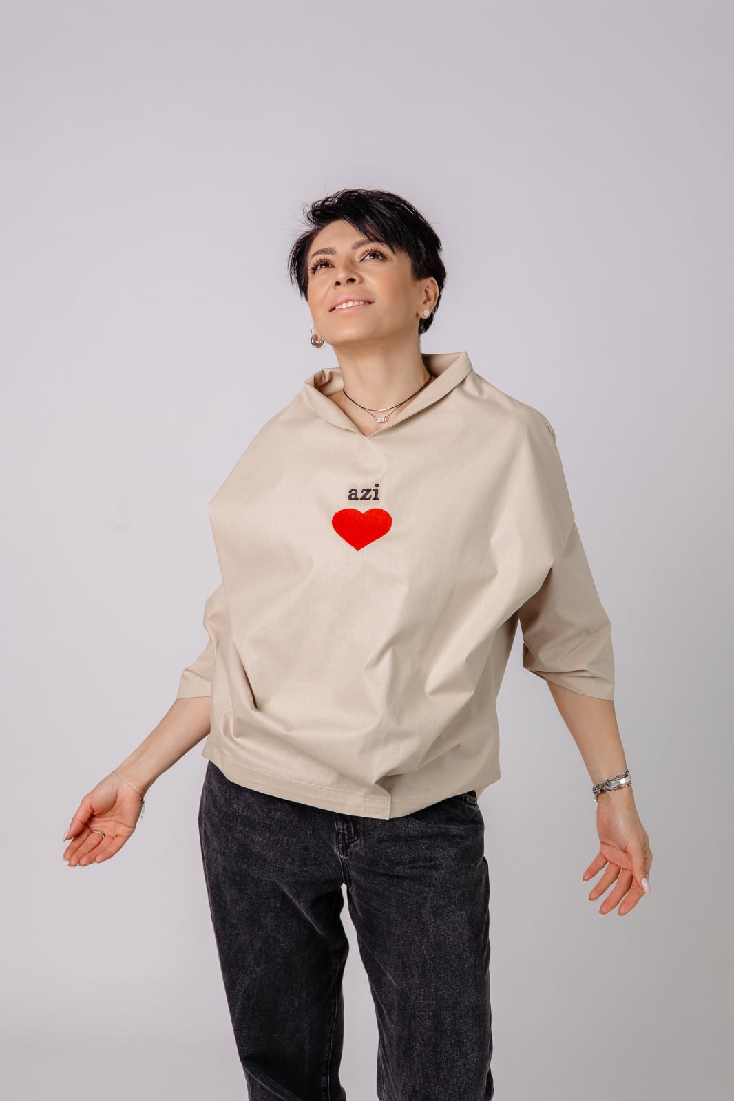 Confectionata cu atentie la detalii, din bumbac organic, bluza cu o inima delicat pictata pe piept si mesajul AZI, este un simbol al prezentului, al momentului ce merita trait din plin. Croiul acesteia este lejer, maneca 3/4, pliuri la baza si la maneci, decolteu decupat in V.