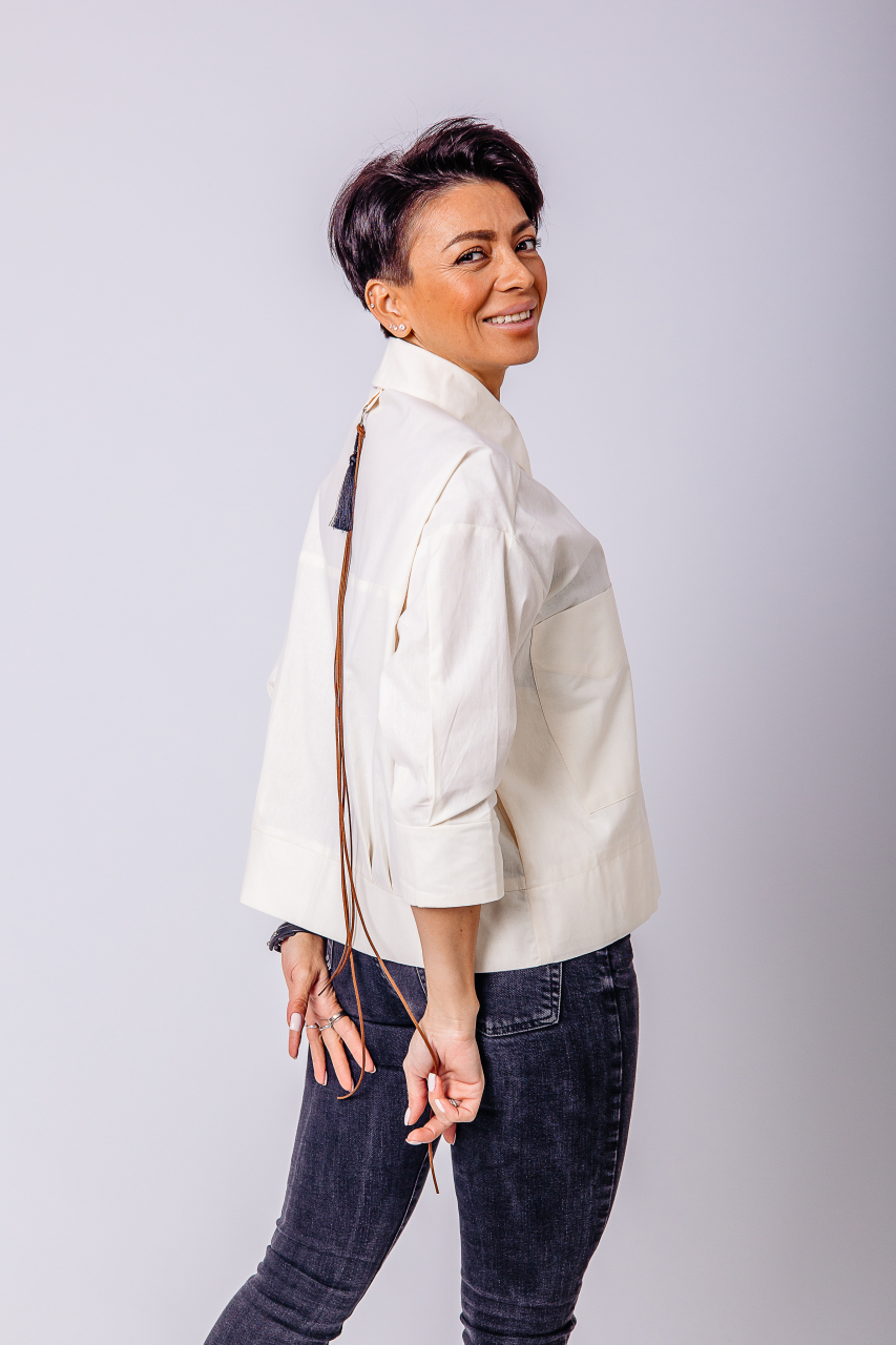Camasa din bumbac 100% cu o croiala lejera si guler si mansete clasice, pentru o atitudine moderna si relaxata. Cu o abordare urbana si versatila, camasa Peplum Clothing imbraca femeia moderna oferindu-i rasfat pielii. Unicitatea piesei realizata cu migala, precum si conceptul nostru de a realiza piese vestimentare practice, ne-au indreptat catre o prindere functionala cu capse metalice cu capac din plastic, alese in contrast dinamic cu suportul textil.