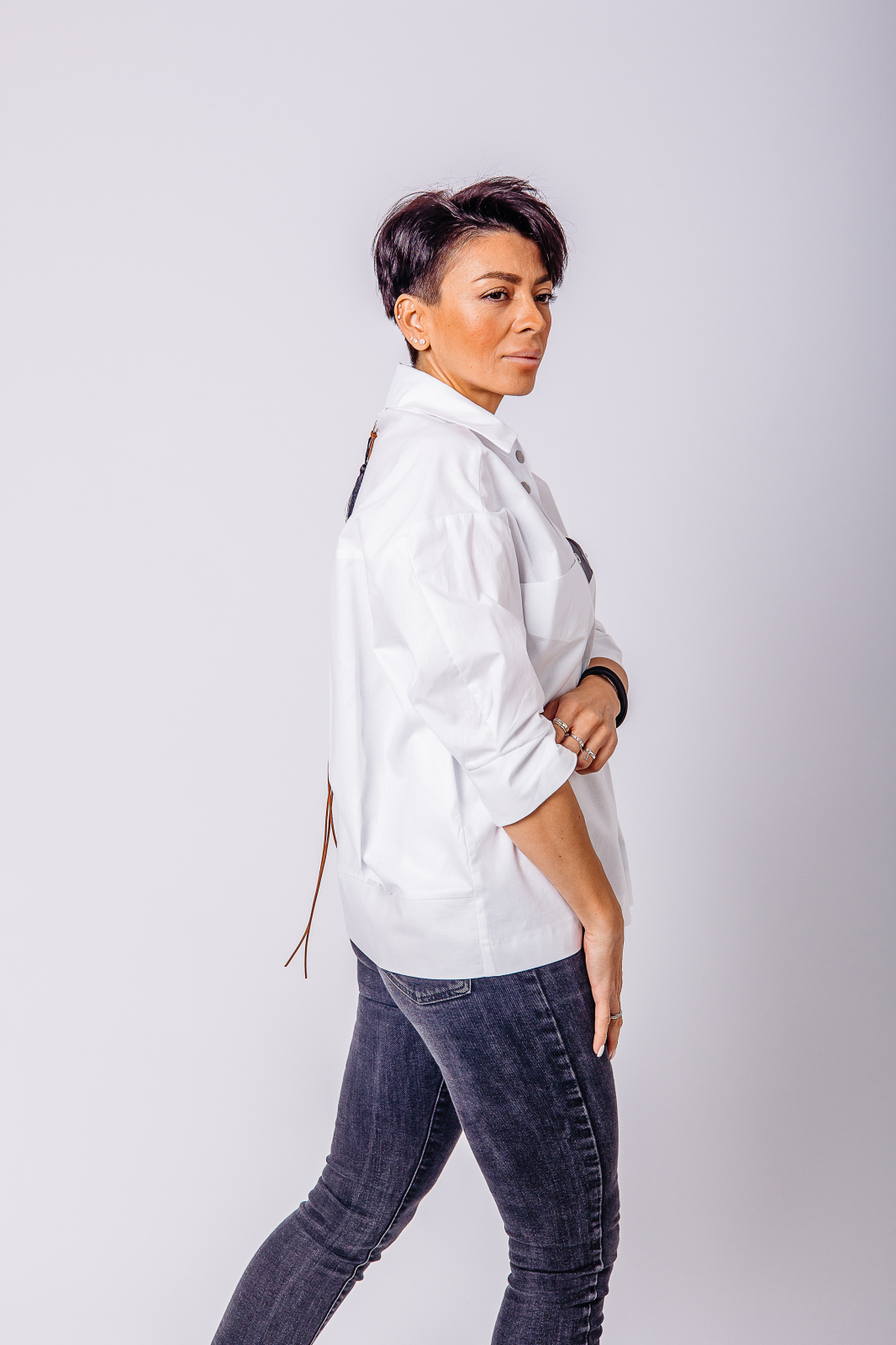 Camasa din bumbac 100% cu o croiala lejera si guler si mansete clasice, pentru o atitudine moderna si relaxata. Cu o abordare urbana si versatila, camasa Peplum Clothing imbraca femeia moderna oferindu-i rasfat pielii. Unicitatea piesei realizata cu migala, precum si conceptul nostru de a realiza piese vestimentare practice, ne-au indreptat catre o prindere functionala cu capse metalice cu capac din plastic, alese in contrast dinamic cu suportul textil.