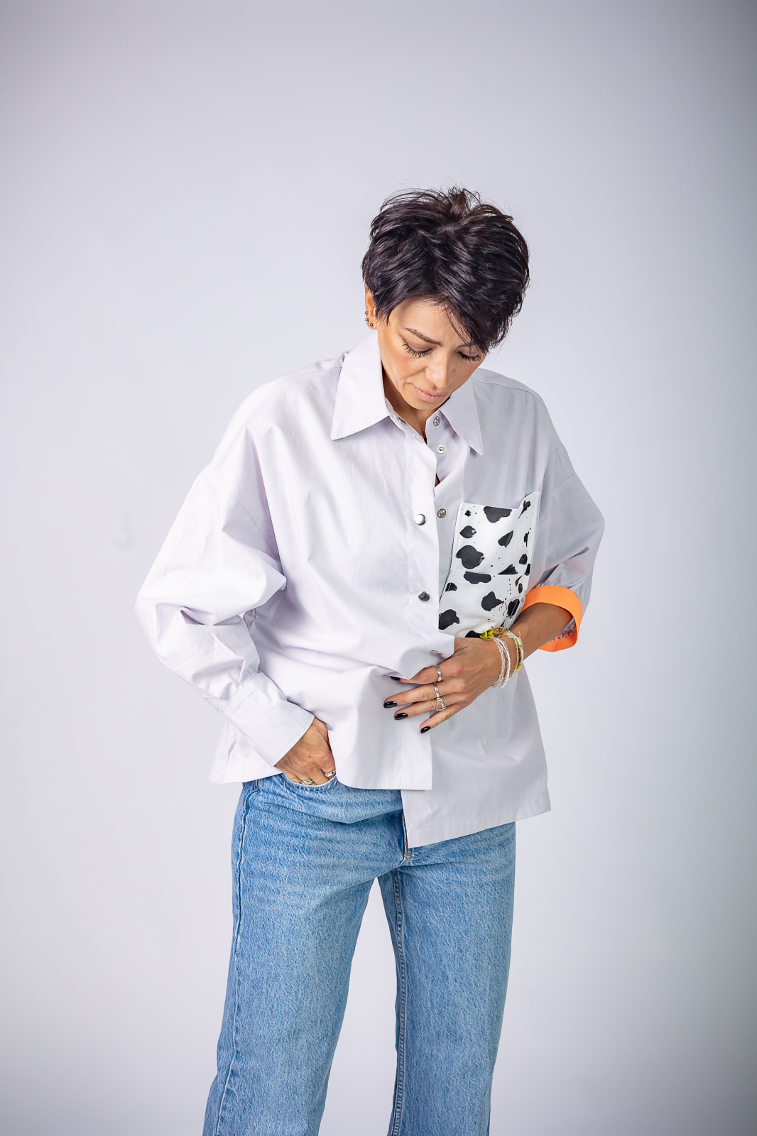 Camasa din bumbac 100% cu o croiala lejera si guler si mansete clasice, pentru o atitudine moderna si relaxata. Cu o abordare urbana si versatila, camasa Peplum Clothing imbraca femeia moderna oferindu-i rasfat pielii. Unicitatea piesei realizata cu migala, pictata manual de artistii nostrii vizuali, precum si conceptul nostru de a realiza piese vestimentare practice, ne-au indreptat catre o prindere functionala cu capse metalice cu capac din plastic, alese in contrast dinamic cu suportul textil.