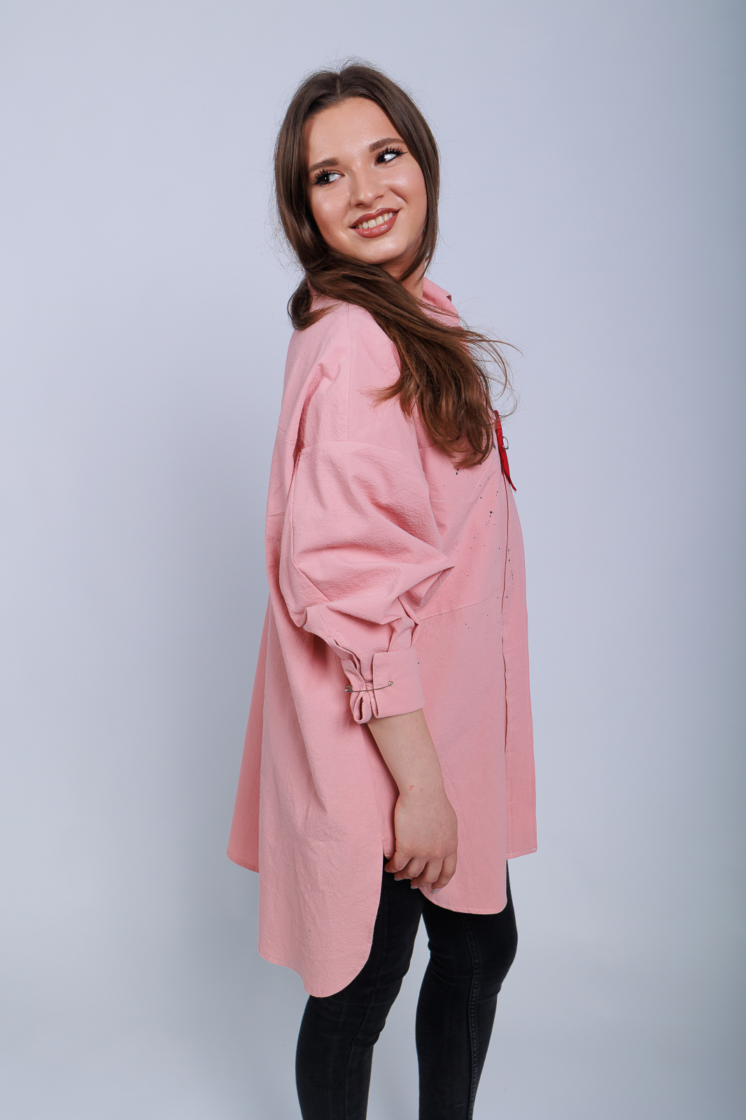 Realizata din bumbac natural, usor creponat, camasa ofera un confort termic excelent si o textura placuta la atingere. Are croiala lunga, maneci lungi cu mansete si prindere cu accesoriu inima. Poate fi purtata ca atare, cat si descheiata peste un top,pentru un efect relaxat si cool.
