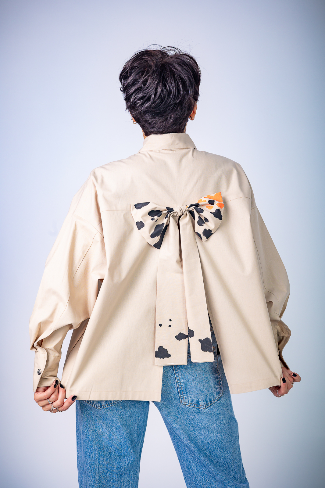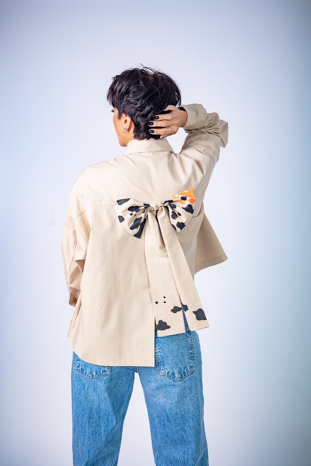 Camasa din bumbac organic, desfacuta la spate, cu accesoriu funda pictata manual si prindere in capse.