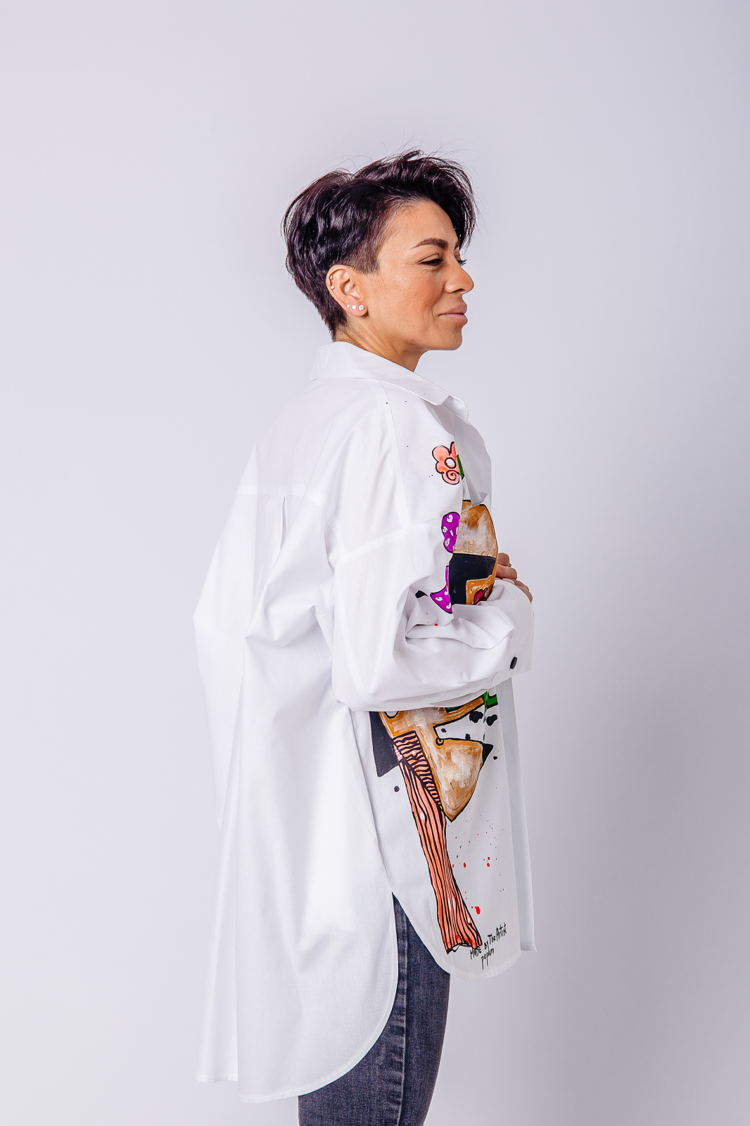 Camasa din bumbac 100% cu o croiala lejera si guler si mansete clasice, pentru o atitudine moderna si relaxata. Cu o abordare urbana si versatila, camasa Peplum Clothing imbraca femeia moderna oferindu-i rasfat pielii. Unicitatea piesei realizata cu migala, pictata manual de artistii nostrii vizuali, precum si conceptul nostru de a realiza piese vestimentare practice, ne-au indreptat catre o prindere functionala cu capse metalice cu capac din plastic, alese in contrast dinamic cu suportul textil.