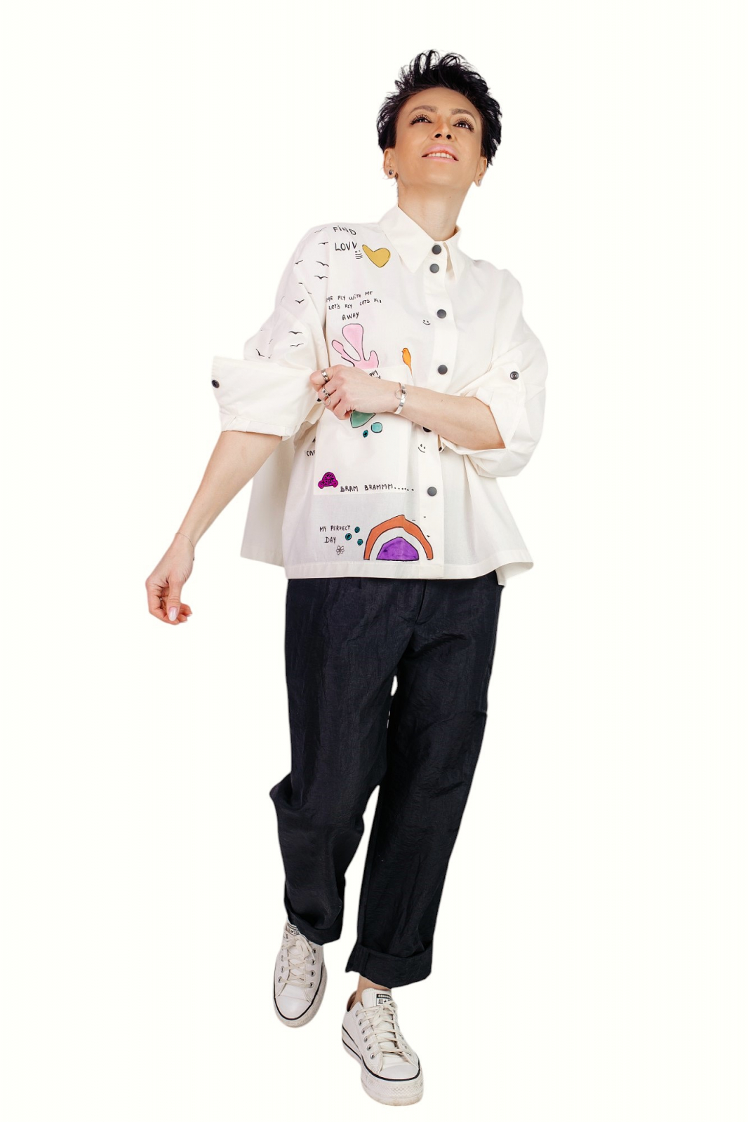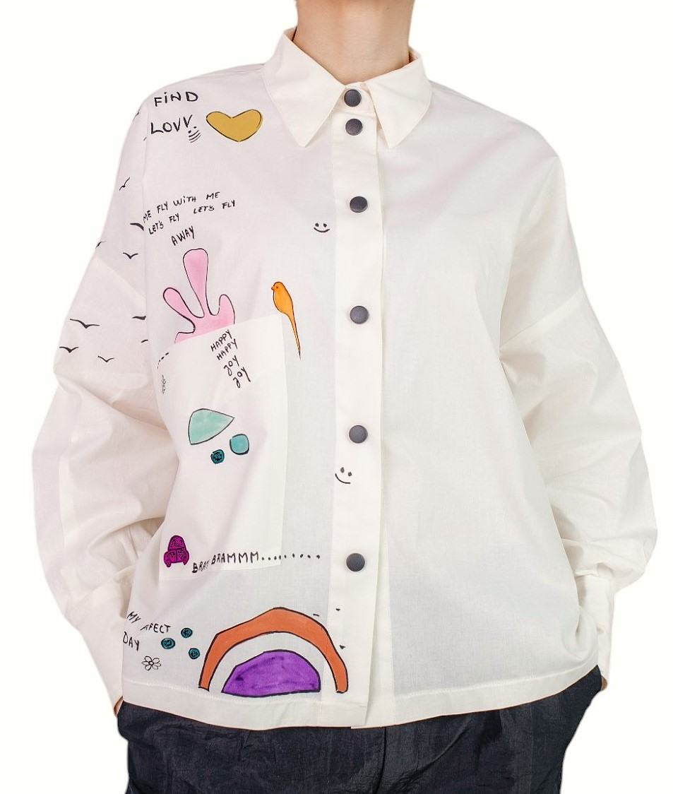 Camasa din bumbac 100% cu o croiala lejera si guler si mansete clasice, pentru o atitudine moderna si relaxata. Cu o abordare urbana si versatila, camasa Peplum Clothing imbraca femeia moderna oferindu-i rasfat pielii. Unicitatea piesei realizata cu migala, pictata manual de artistii nostrii vizuali, precum si conceptul nostru de a realiza piese vestimentare practice, ne-au indreptat catre o prindere in capse, capse metalice cu capac din plastic, alese in contrast dinamic cu suportul textil.