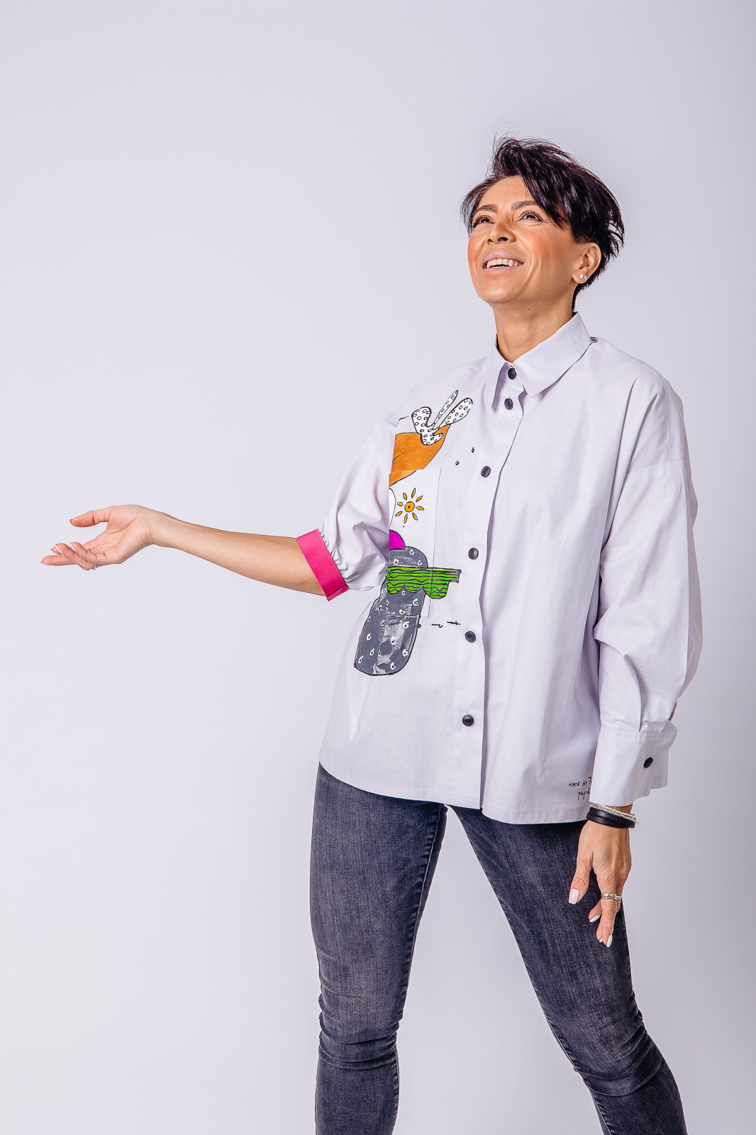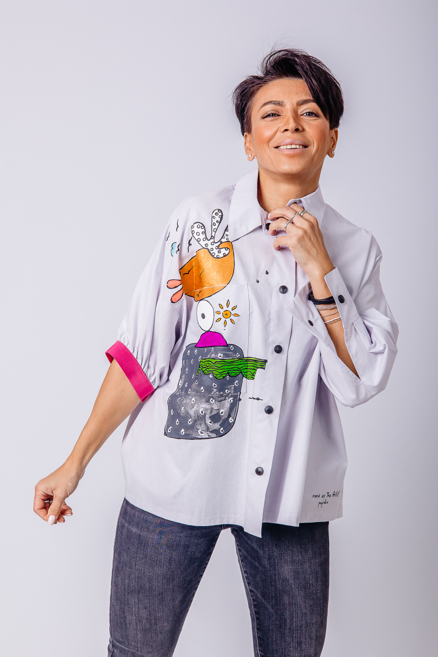 Camasa din bumbac 100% cu o croiala lejera si guler si mansete clasice, pentru o atitudine moderna si relaxata. Cu o abordare urbana si versatila, camasa Peplum Clothing imbraca femeia moderna oferindu-i rasfat pielii. Unicitatea piesei realizata cu migala, pictata manual de artistii nostrii vizuali, precum si conceptul nostru de a realiza piese vestimentare practice, ne-au indreptat catre o prindere functionala cu capse metalice cu capac din plastic, alese in contrast dinamic cu suportul textil.