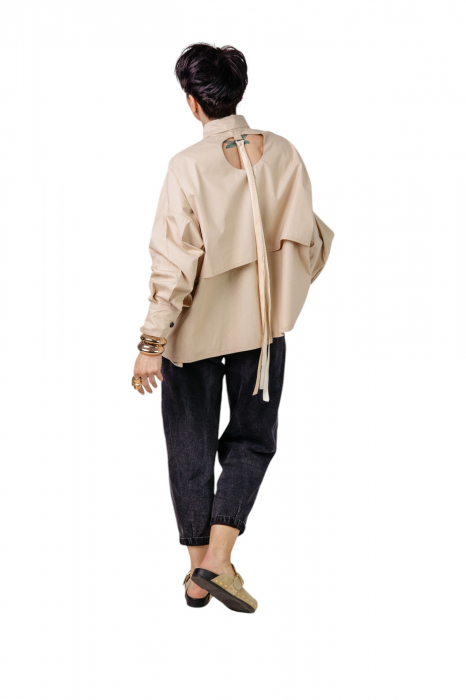 Camasa din bumbac organic, cu guler clasic si prindere in capse. Spate cu decupaj, accesoriu metalic si snururi.