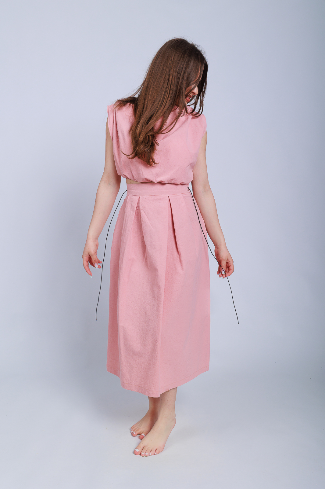 Bluza, scurtă până în talie, are o ținută lejeră, dar atent structurată. Faldurile fine de pe umeri adaugă volum și personalitate, evocând petalele unei flori în plină înflorire. Este o piesă ce respiră aerul boem al tradiției reinterpretate modern, cu un aer proaspăt și poetic.