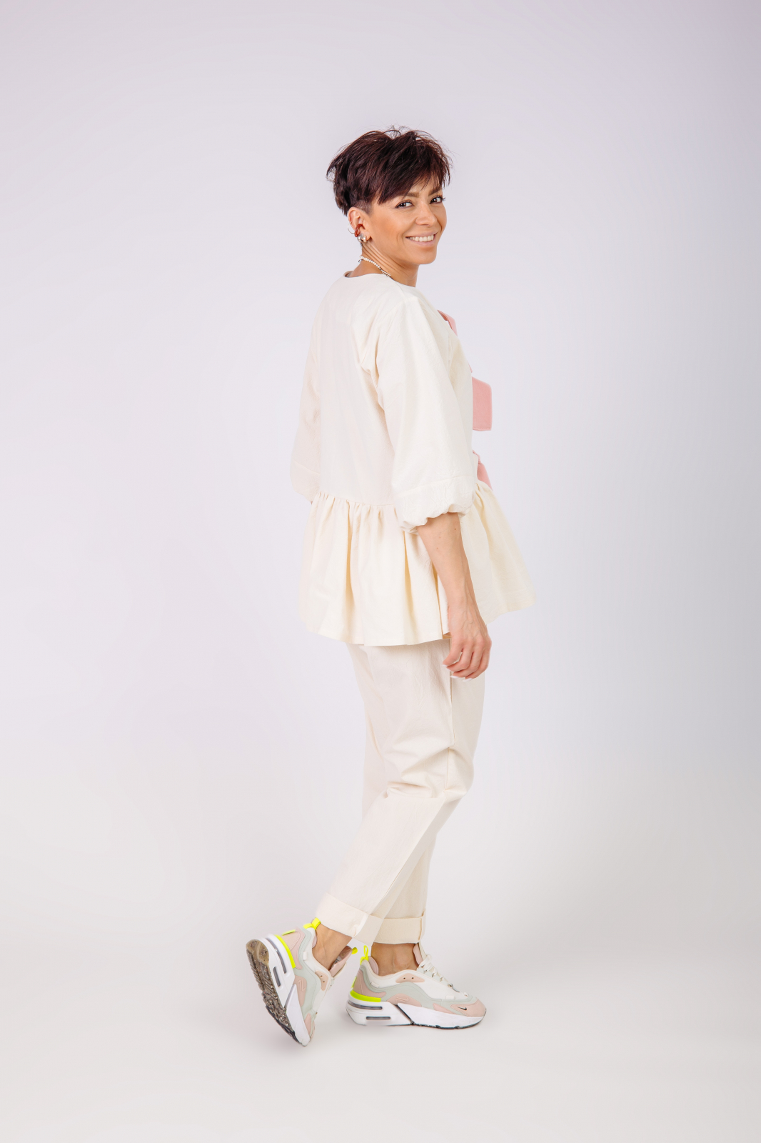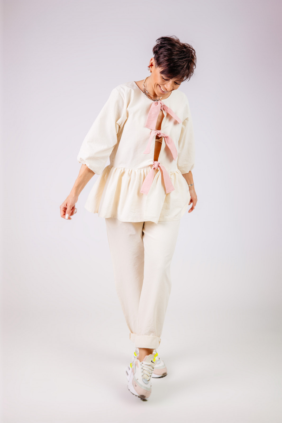 Compleu realizat din panza topita de bumbac, cu pantalon lejer si usor conic si bluza cu peplum si inchidere in fata cu panghici contrast.