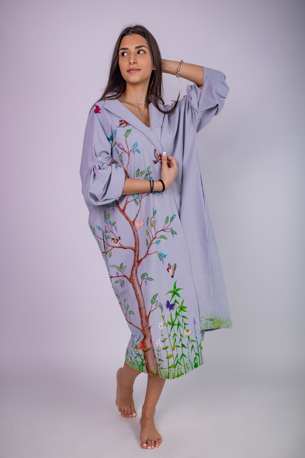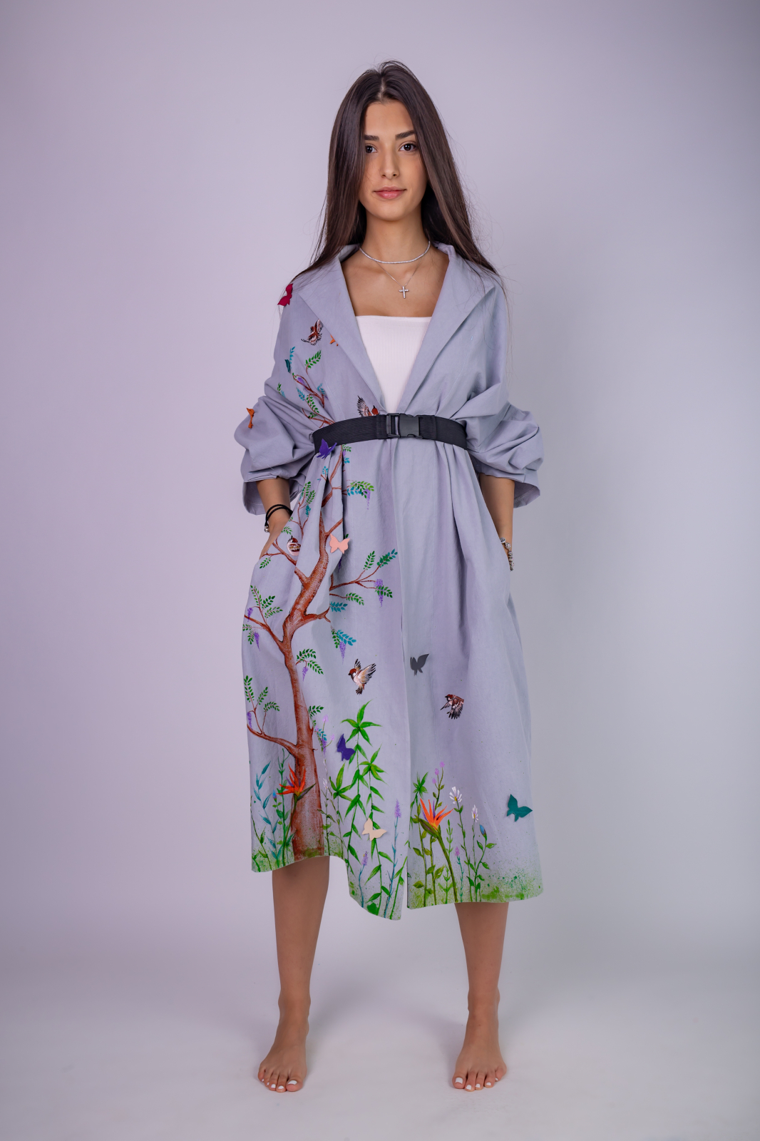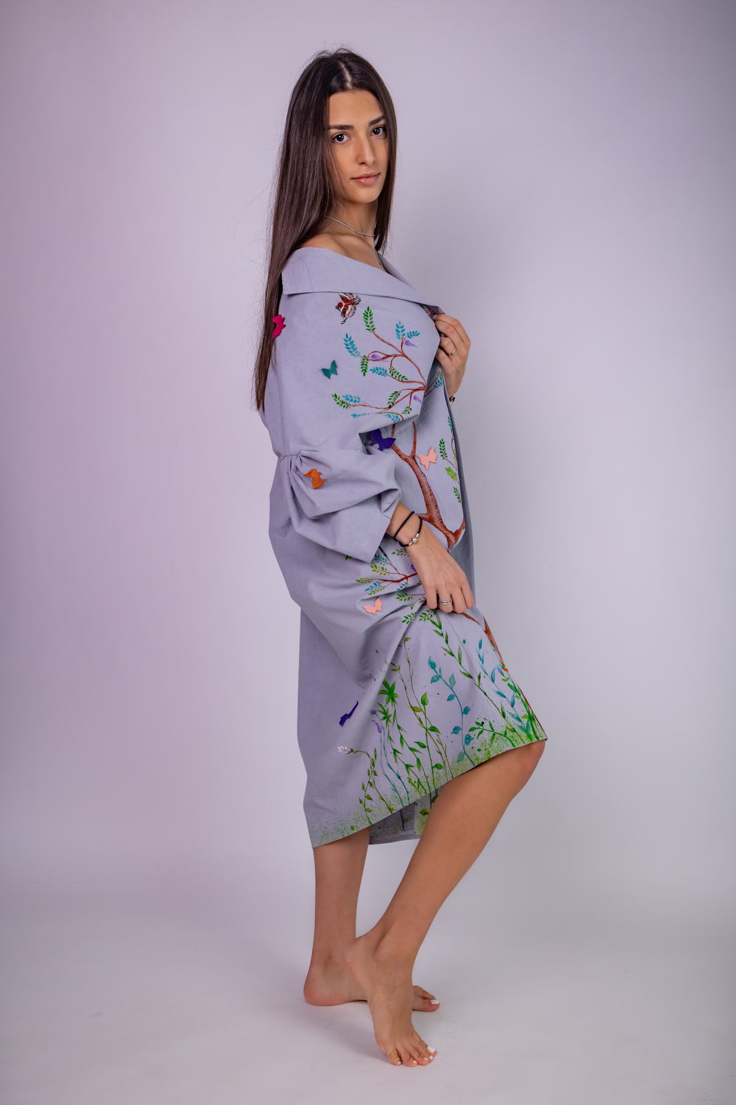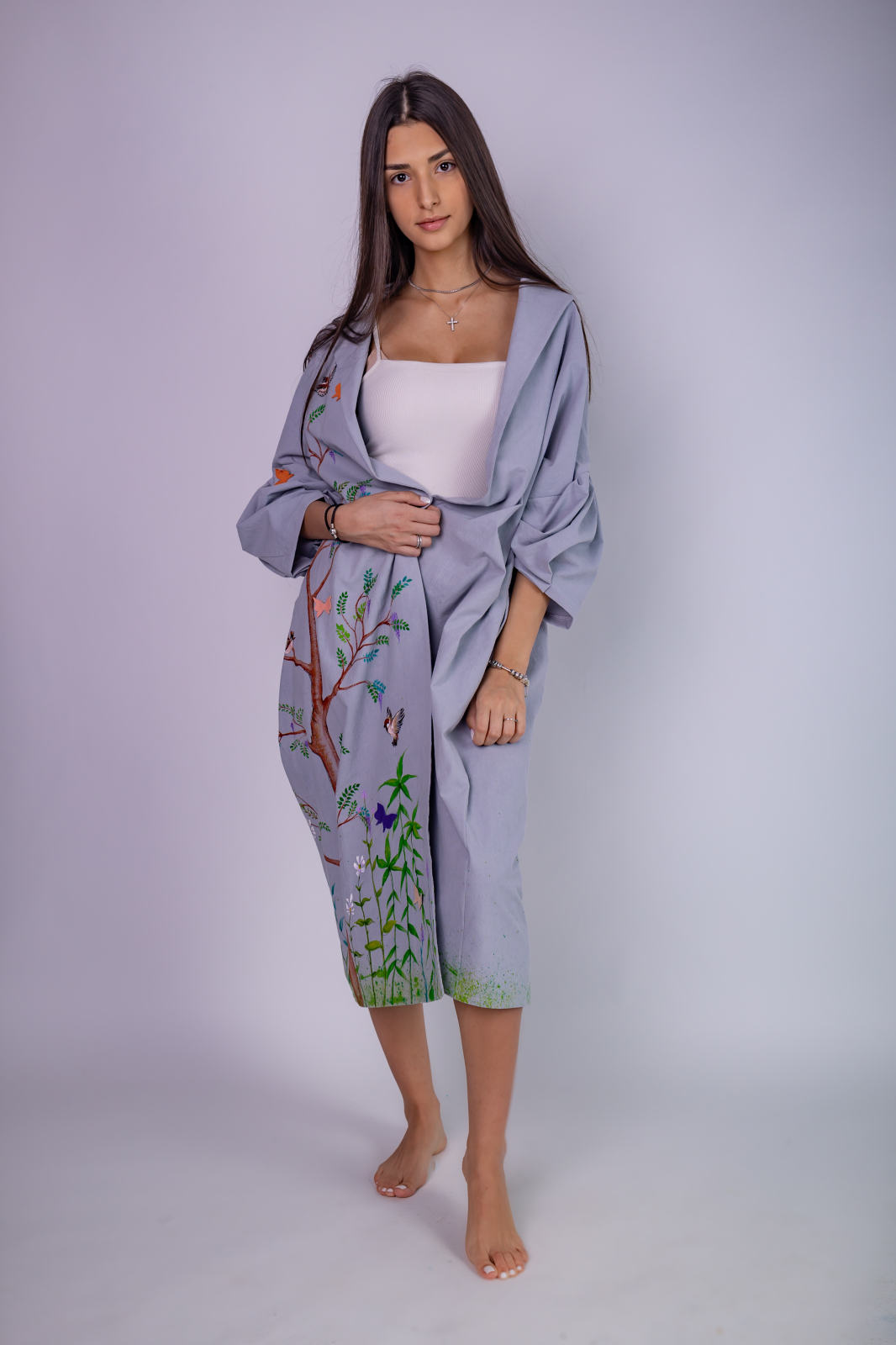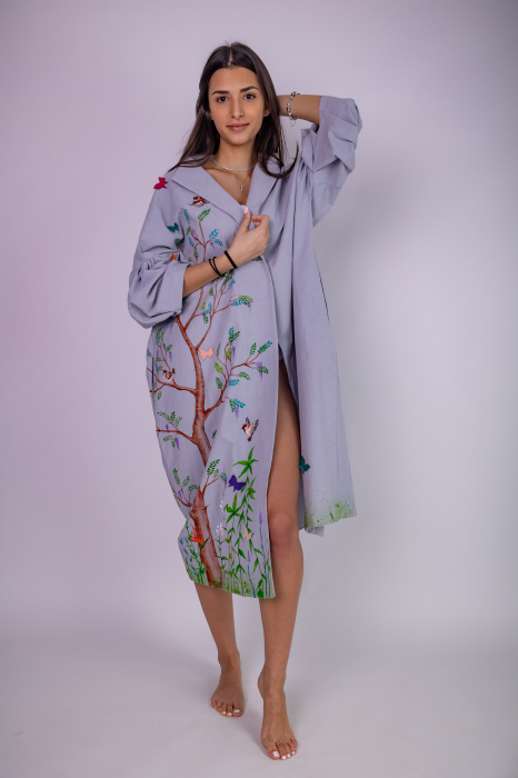 Piesa vestimentara versatila, creata sa- ti imbrace trupul si starea de spirit, pentru orice moment sau eveniment din viata ta. Gandit cu pasiunea unui designer si daruirea de stare a unui pictor, aceasta piesa vine sa ti completeze tinuta, desfasurat pe trup, ori sa iti fie rochie ce iti cuprinde talia cu o curea, sau chiar lejer, de casa, in zilele in care vrei sa te simti rasfatata si speciala.