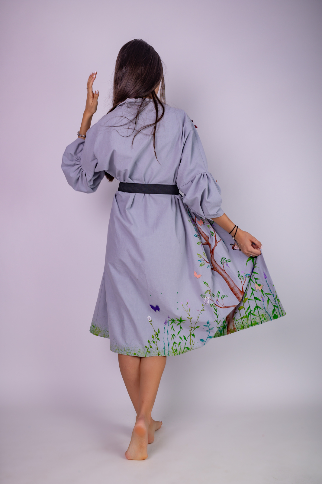 Piesa versatila ce poate fi purtata ca rochie, ori cardigan, din panza topita de bumbac calitate premium, cu maneci bufante si croiala usor balon, aplicatii din piele naturala si ecologica, marime universala.