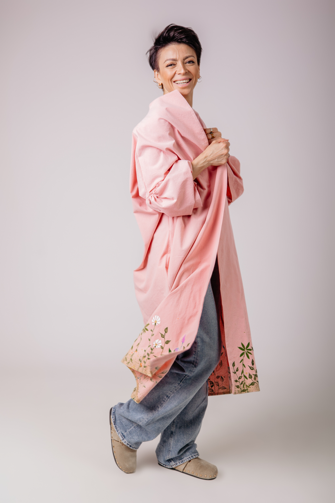 Piesa vestimentara versatila, creata sa- ti imbrace trupul si starea de spirit, pentru orice moment sau eveniment din viata ta. Gandit cu pasiunea unui designer si daruirea de stare a unui pictor, aceasta piesa vine sa ti completeze tinuta, desfasurat pe trup, ori sa iti fie rochie ce iti cuprinde talia cu o curea, sau chiar lejer, de casa, in zilele in care vrei sa te simti rasfatata si speciala.