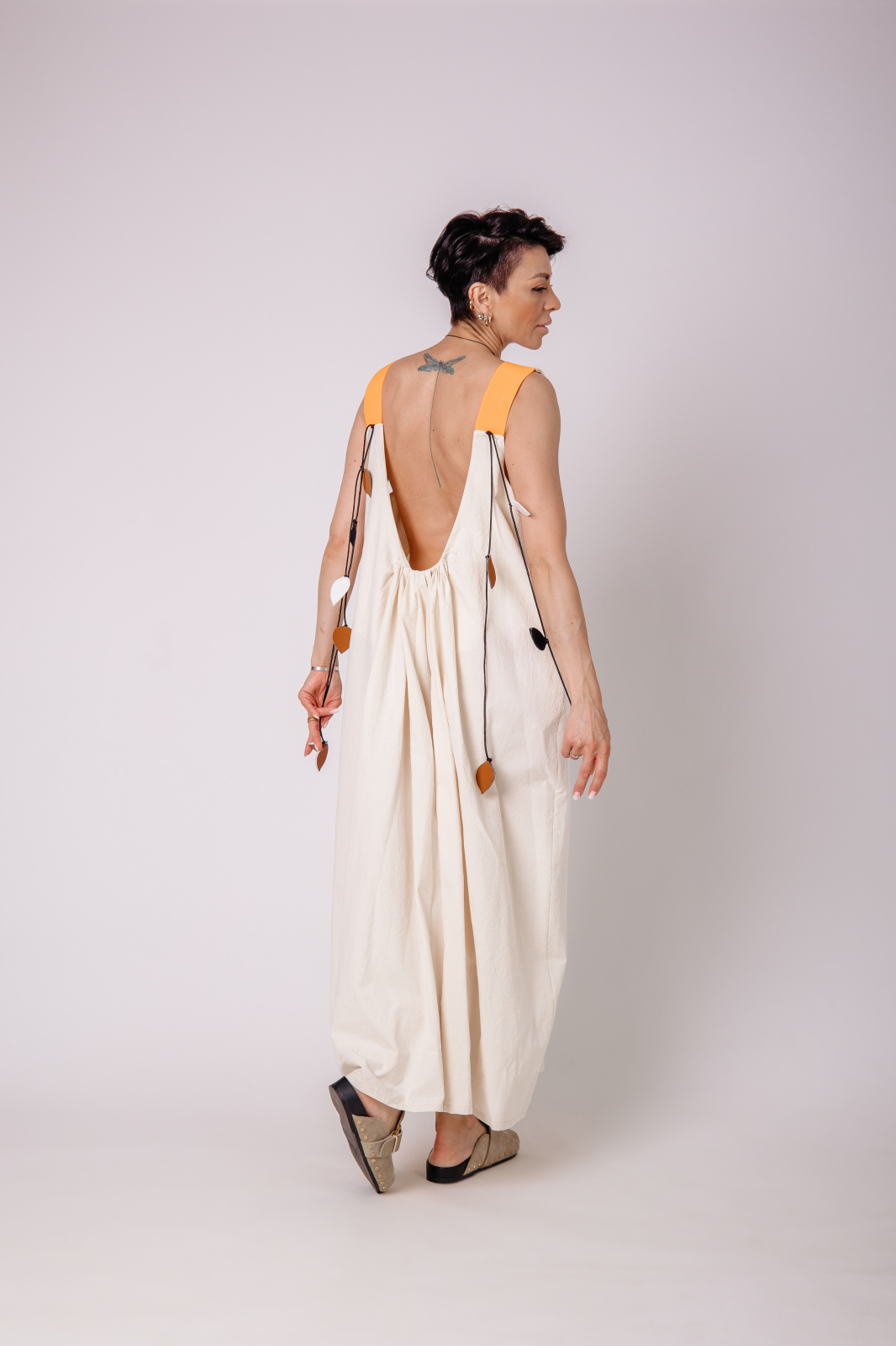 Rochie cu croiala balon, decupata la spate, buzunare laterale si accesoriu pentru bretele.