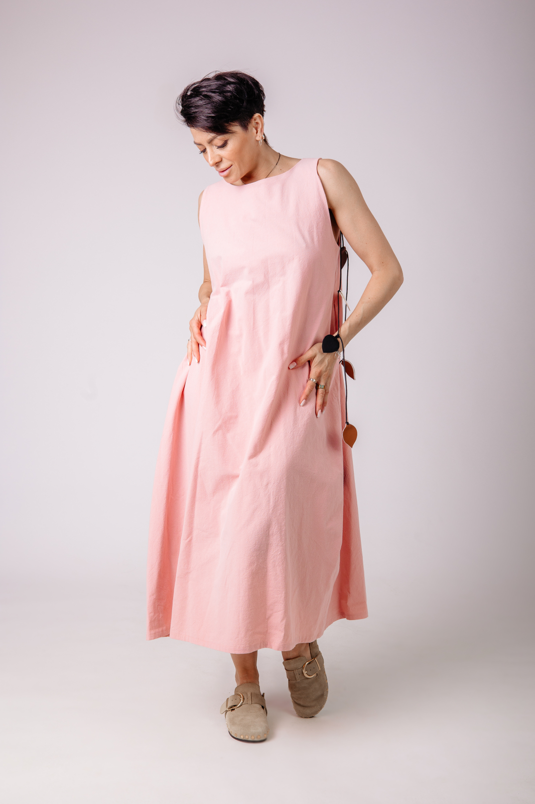 Rochie cu croiala balon, decupata la spate, buzunare laterale si accesoriu pentru bretele.